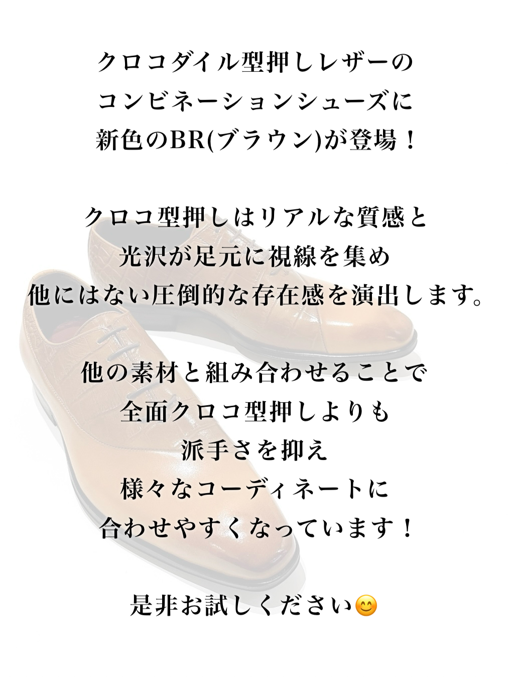 クロコダイル型押しレザーのコンビネーションシューズに新色のBR(ブラウン)が登場!